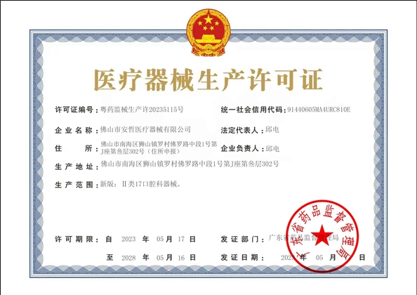 มาตรฐาน:Medical products production certificate หมายเลข:20235115 วันที่ออก:2023-05-17 วันหมดอายุ:2028-05-17 ขอบเขต/ระยะ:dental products ออกโดย:广东省药品监督管理局 |